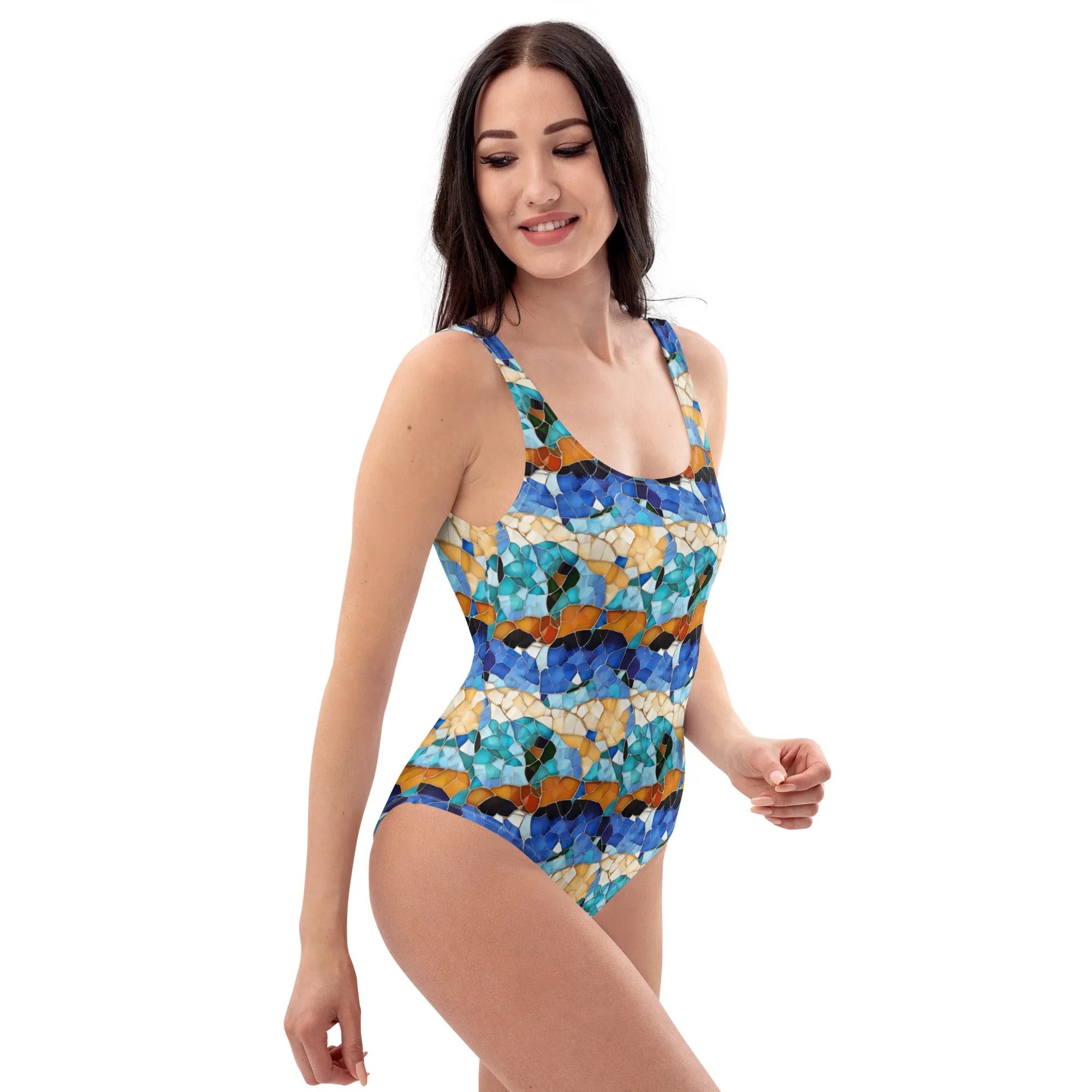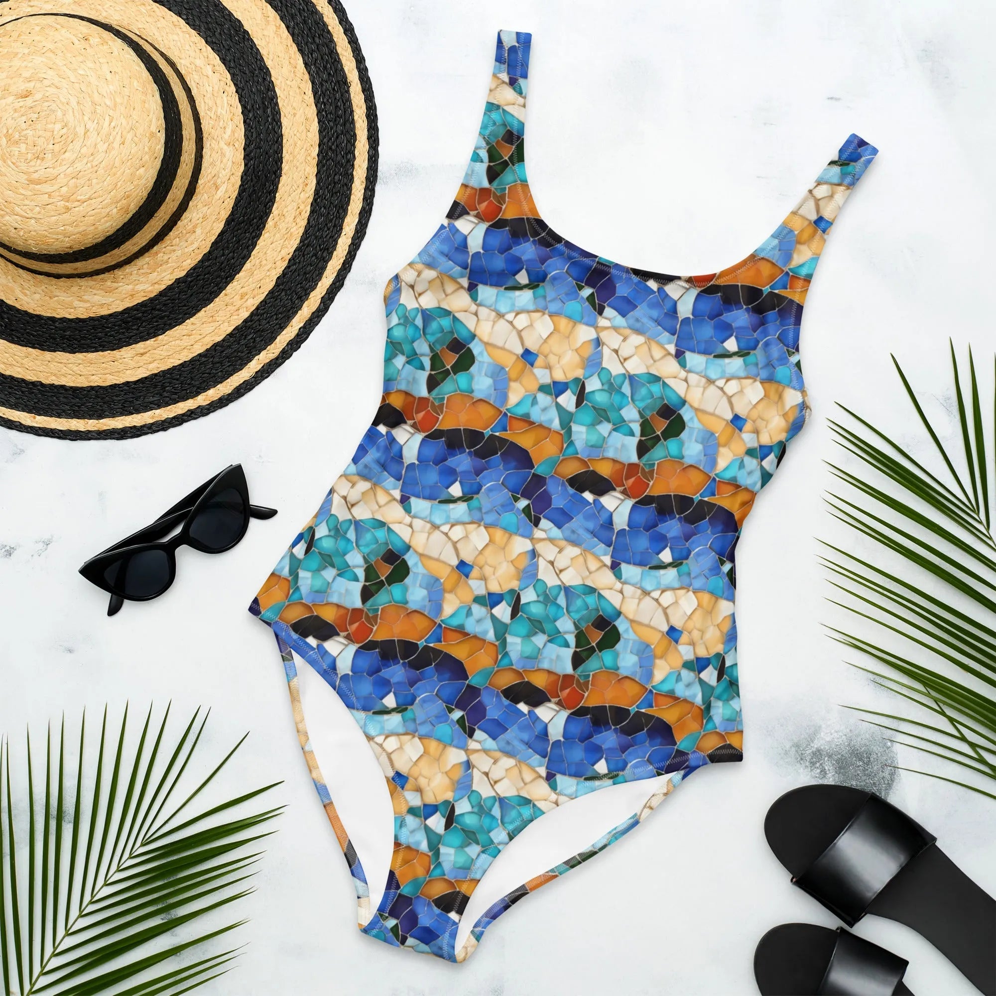 Make a splash in vibrant Modernist flair with our Sitges Tilewave Mosaic One-Piece Swimsuit. Inspired by the iconic tiles of Parc Güell and the radiant energy of Barcelona, this suit features a bold broken-tile mosaic that channels Mediterranean charm with every wear. Flattering, colorful, and designed to turn heads—it’s swimwear with serious personality.