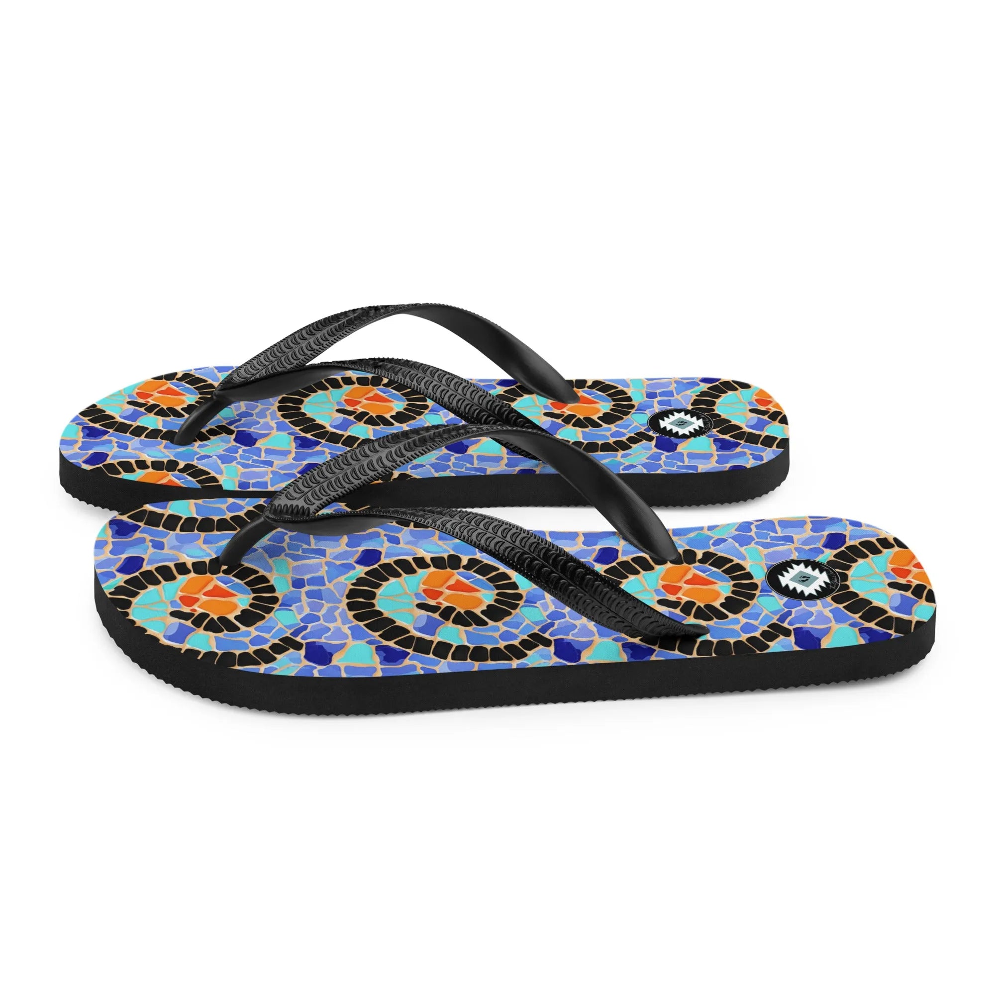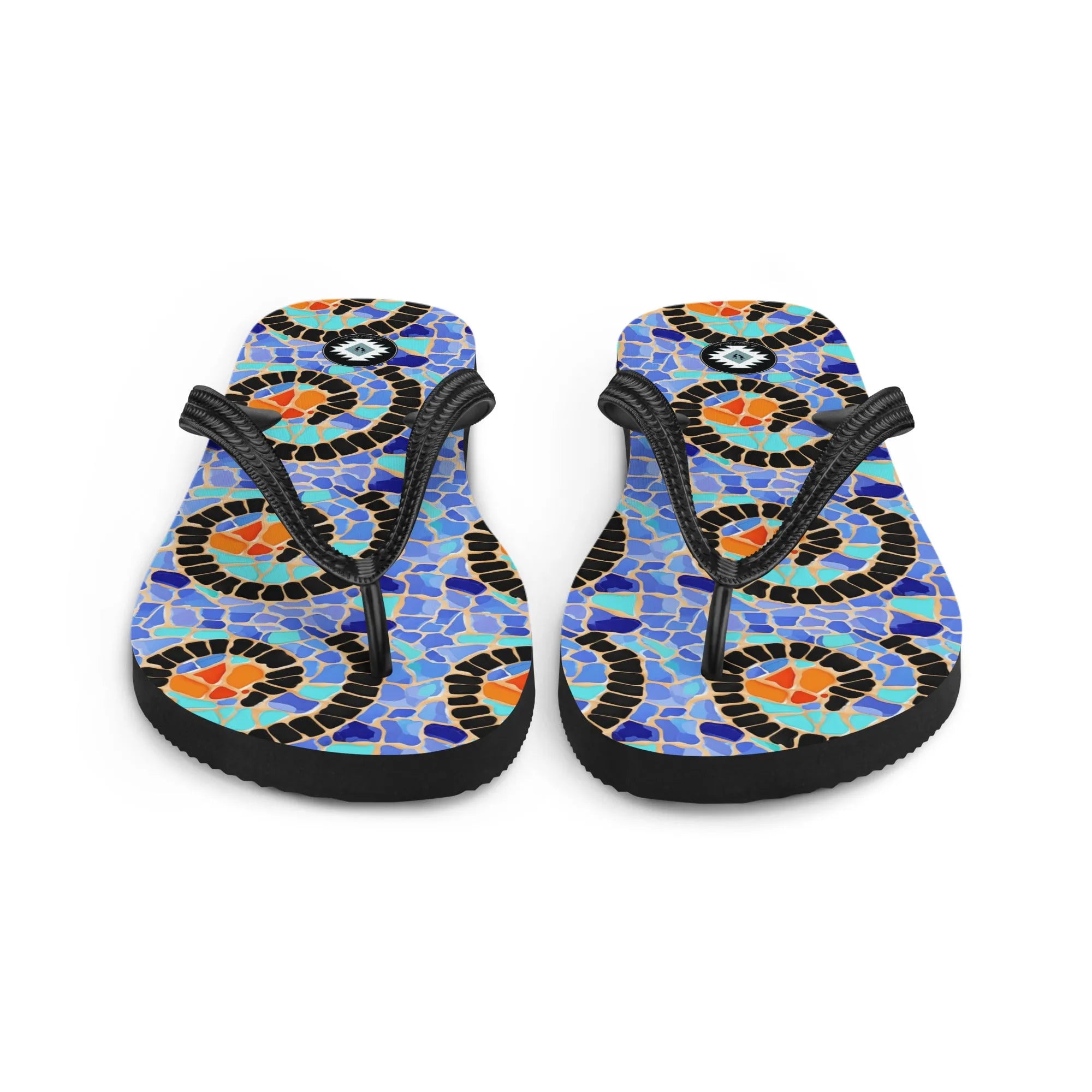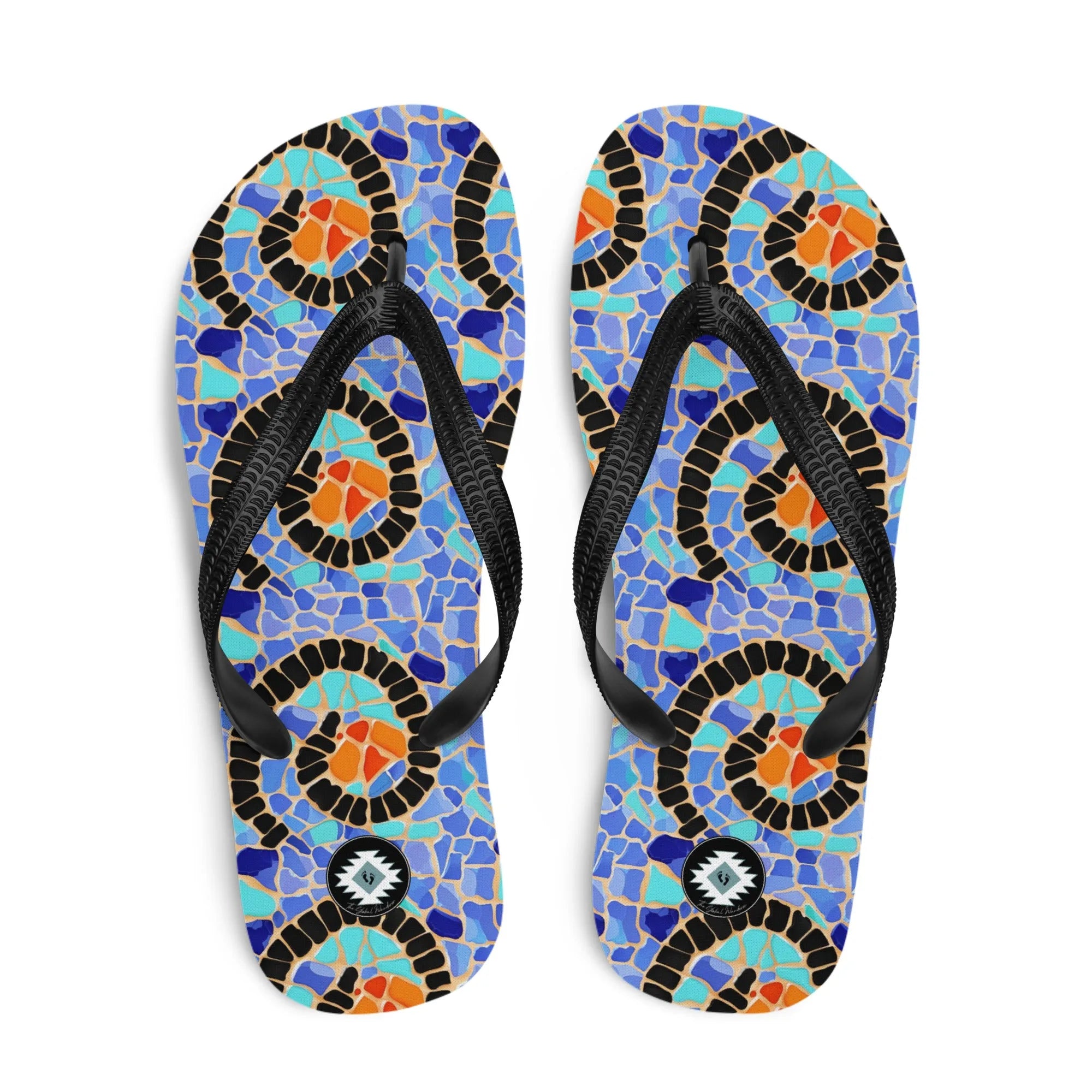 Step into summer with our Reus Twirl Flip Flops—where vibrant design meets everyday comfort. Inspired by the playful mosaic tiles of Parc Güell, this pair features a bold mix of blue and orange broken-tile patterns that capture the spirit of Catalan Modernism. Lightweight, durable, and made for warm, carefree days, they’re the perfect pop of personality for your feet.