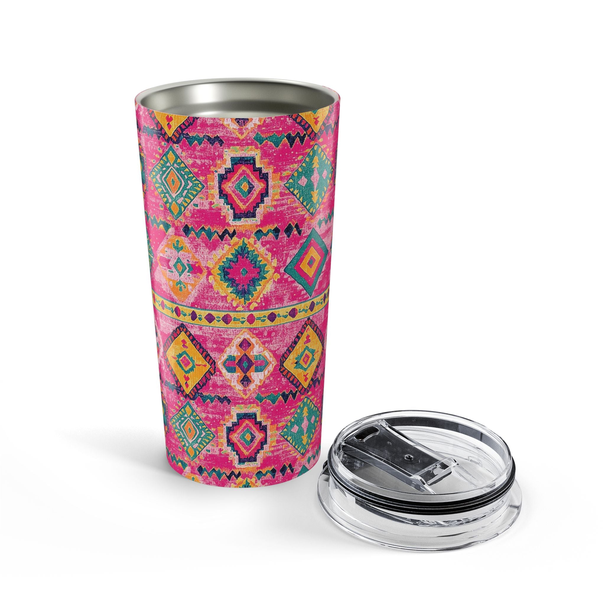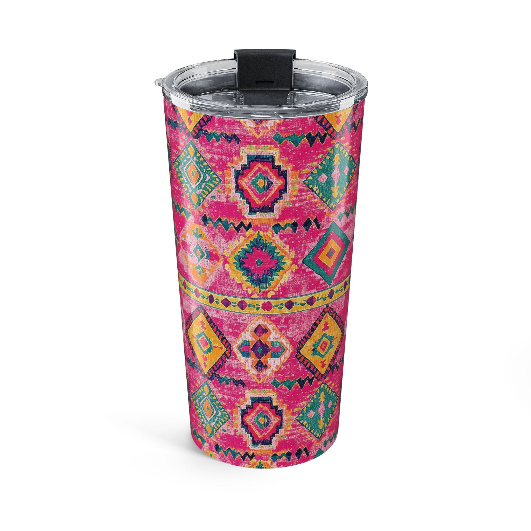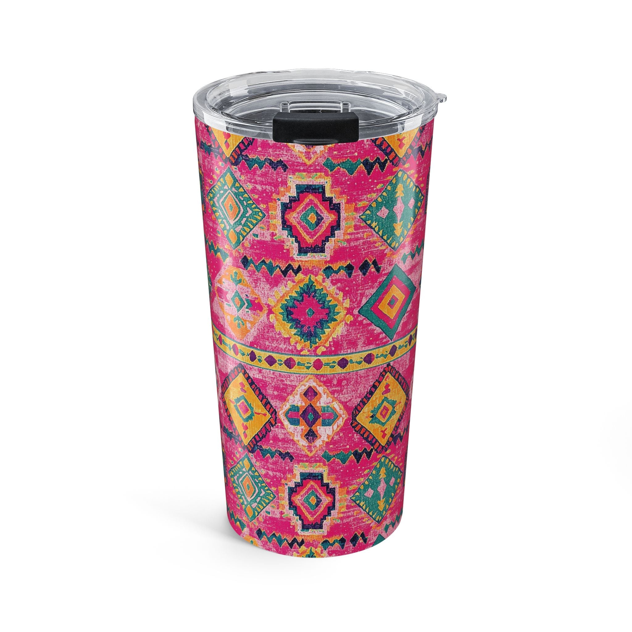 Inspired by the bold patterns of Turkish Kilim rugs, this tumbler showcases vibrant pink geometric designs that bring a touch of charm to your daily routine. With its durable build and insulated design, it keeps your drinks hot or cold for hours—perfect for staying stylish and hydrated wherever you go!