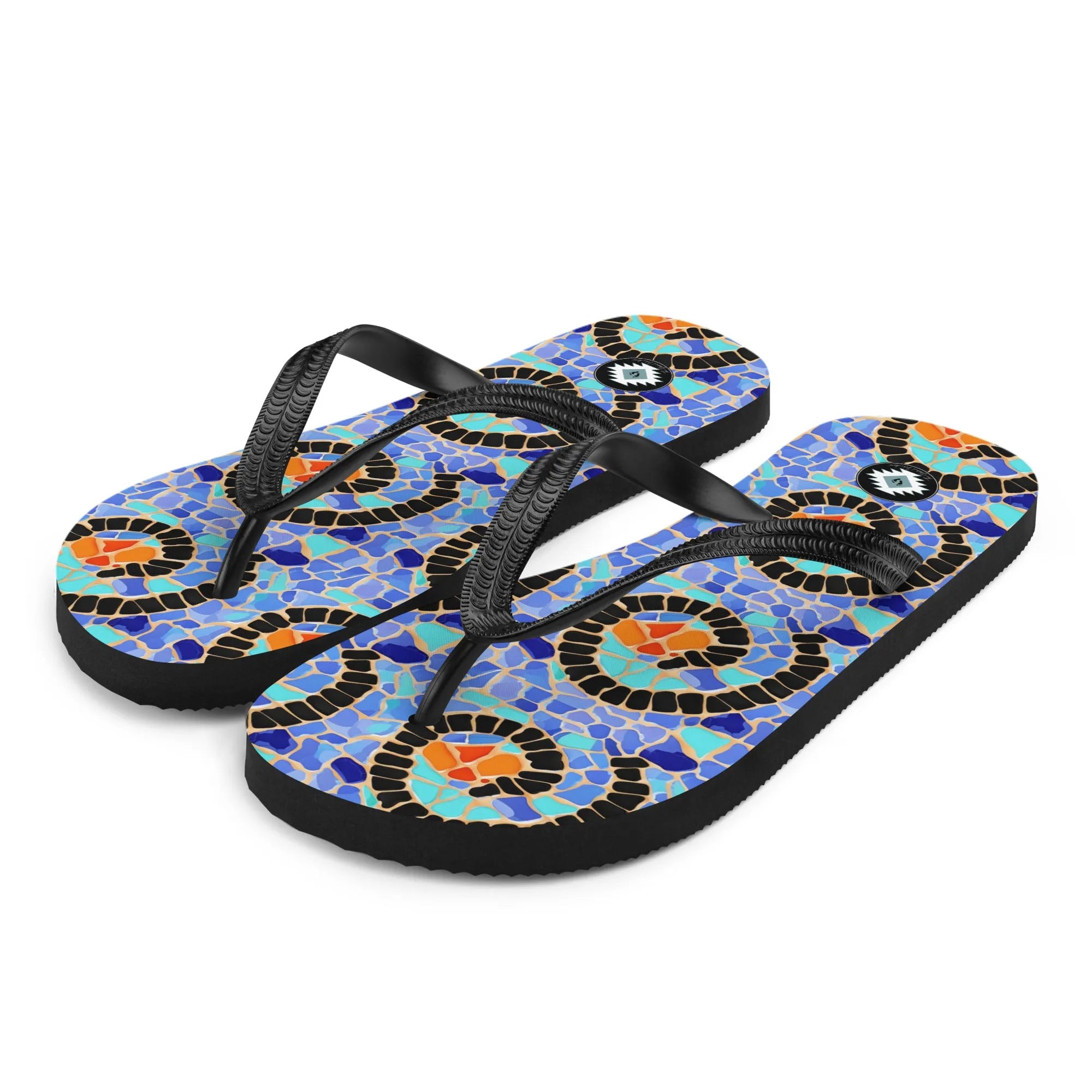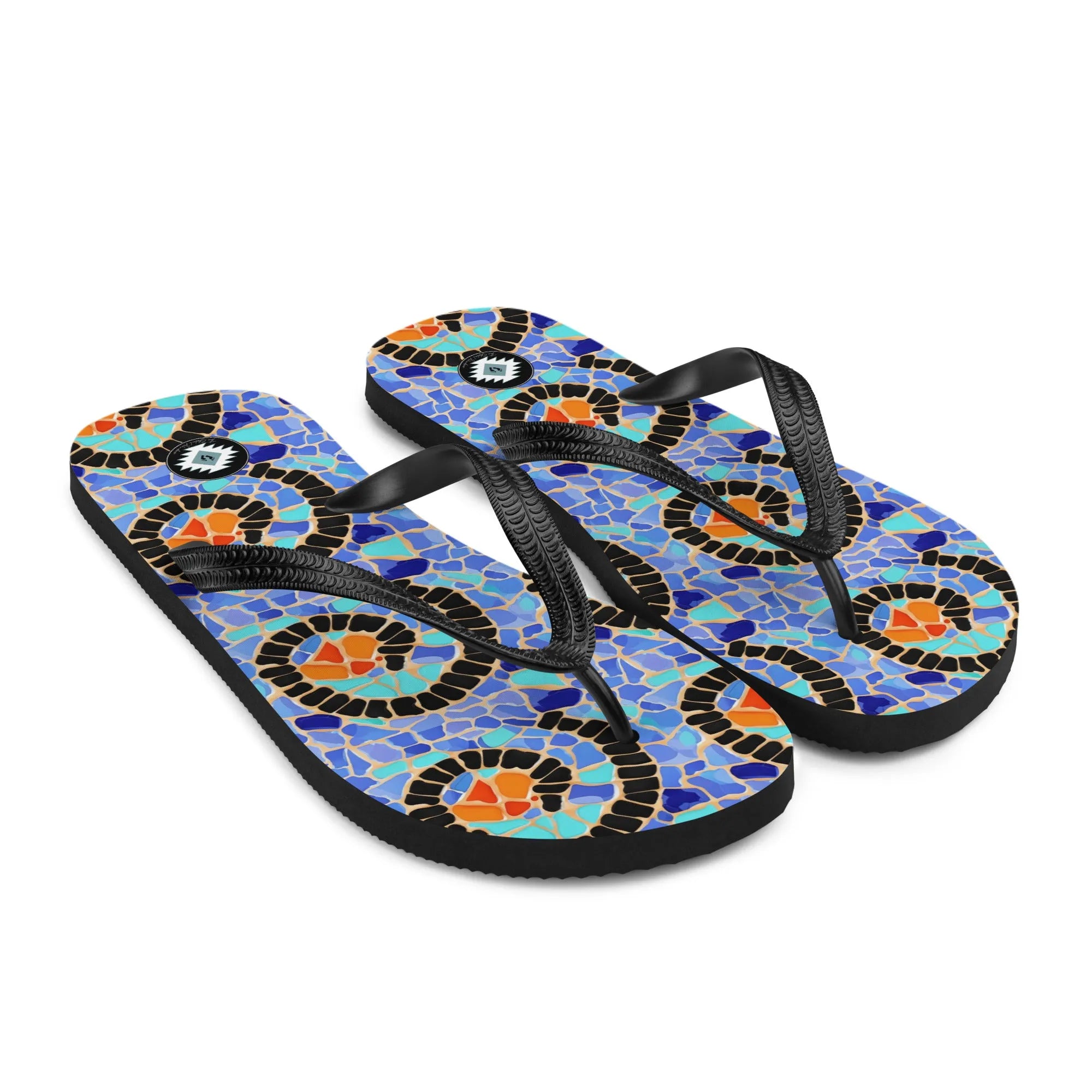 Step into summer with our Reus Twirl Flip Flops—where vibrant design meets everyday comfort. Inspired by the playful mosaic tiles of Parc Güell, this pair features a bold mix of blue and orange broken-tile patterns that capture the spirit of Catalan Modernism. Lightweight, durable, and made for warm, carefree days, they’re the perfect pop of personality for your feet.